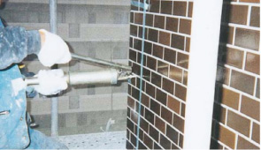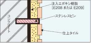 モルタル壁面やタイル壁面が躯体コンクリートから浮いている場合は、エポキシ樹脂注入とステンレス製アンカーピンを併用し、剥落を防止します。
