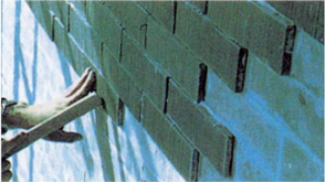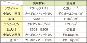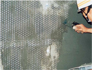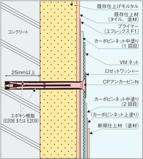 特殊ネット、炭素繊維配合のポリマーセメントモルタルにて強固な剥落防止層を開脚式アンカーピンにて下地に固着させ、モルタル層やタイルの剥落を防止します。